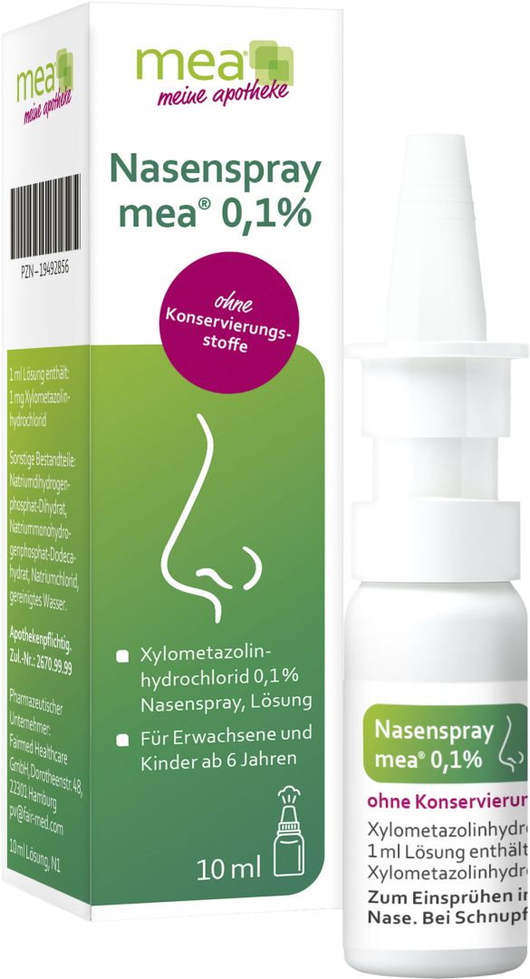 Wirkstoff: Xylometazolinhydrochlorid. Anwendungsgebiete: Nasenspray mea 0,1% ohne Konservierungsstoffe wird angewendet zur Abschwellung der Nasenschleimhaut bei Schnupfen, anfallsweise auftretendem Fließschnupfen (Rhinitis vasomotorica) und allergischem Schnupfen (Rhinitis allergica); zur Erleichterung des Sekretabflusses bei Entzündung der Nasennebenhöhlen sowie bei Katarrh des Tubenmittelohrs in Verbindung mit Schnupfen. Nasenspray mea 0,1% ohne Konservierungsstoffe ist für Erwachsene, Jugendliche und Kinder über 6 Jahren bestimmt.