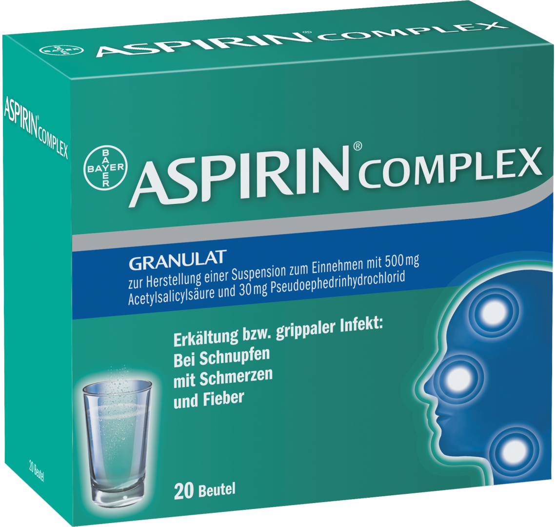 Wirkstoffe: Acetylsalicylsäure, Pseudoephedrinhydrochlorid. Anwendungsgebiete: Zur symptomatischen Behandlung von Schleimhautschwellung der Nase und Nebenhöhlen bei Schnupfen (Rhinosinusitis) mit Schmerzen und Fieber im Rahmen einer Erkältung bzw. eines grippalen Infektes. Hinweis: Enthält Saccharose und Benzylalkohol. Ohne ärztlichen Rat nicht länger anwenden als in der Packungsbeilage vorgegeben!