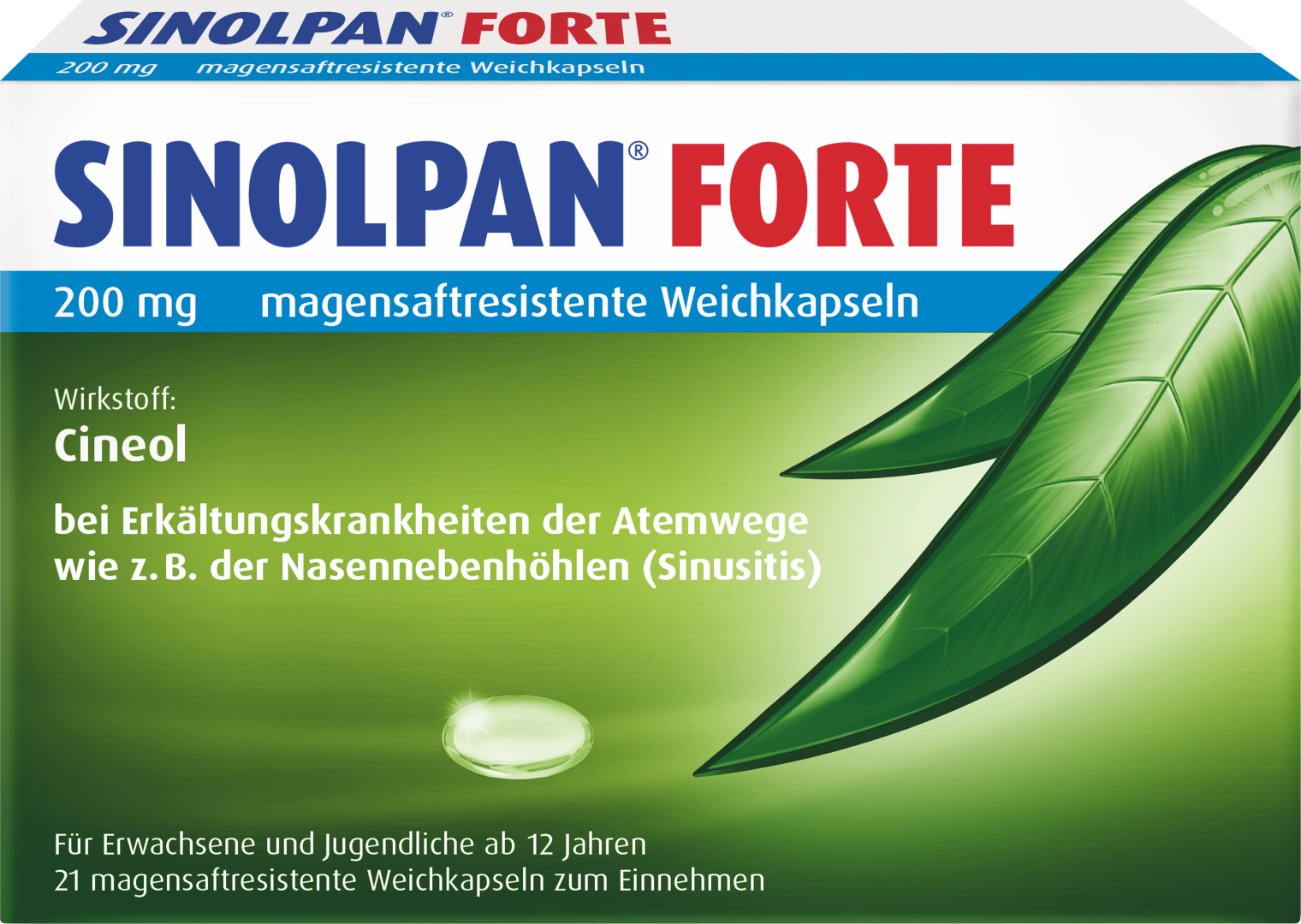 Wirkstoff: Cineol. Anwendungsgebiete: Zur Behandlung der Symptome bei Bronchitis und Erkältungskrankheiten der Atemwege. Zur Zusatzbehandlung bei chronischen und entzündlichen Erkrankungen der Atemwege, z. B. der Nasennebenhöhlen (Sinusitis). Warnhinweis: Enthält Sorbitol und Phospholipide aus Sojabohnen.